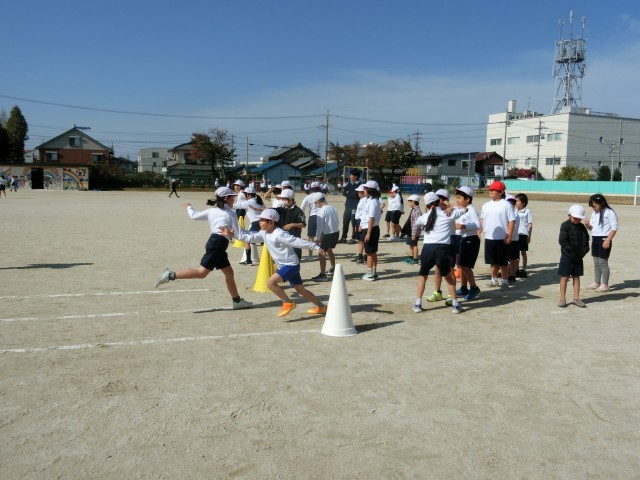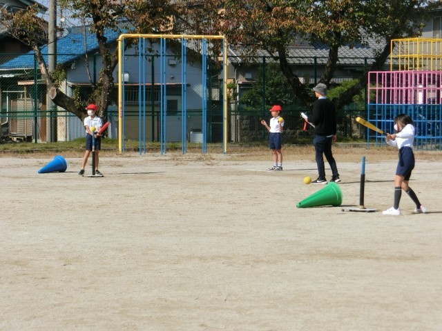 1年生は生活科の学習で、フウセンカズラの熟した種と未熟の種を見比べて違いを話し合っていました。3年生は体育科でタッチリレーを行っていました。5年生は体育科でティーボールに取り組んでいました。