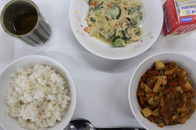 麦ご飯 牛乳 マーボどうふ バンバンジーサラダ でした。