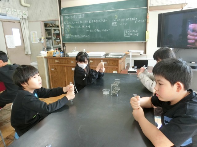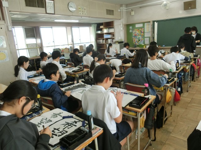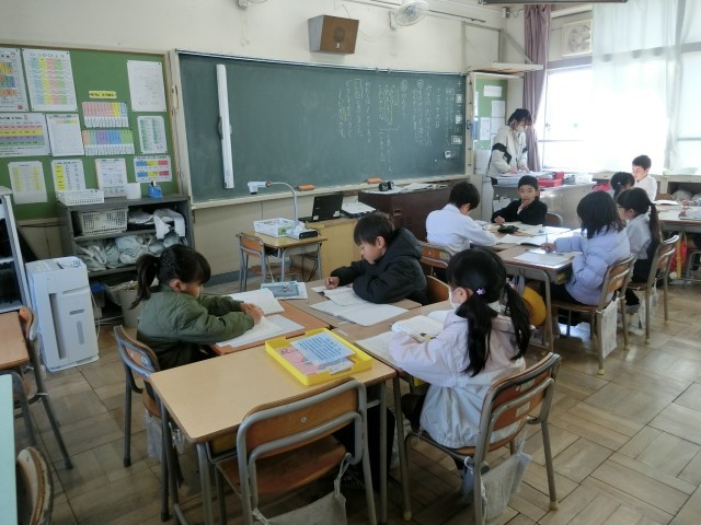 2年生は、国語の授業でした。『みきのたからもの』という物語文を読み、子どもたちは教科書の本文で気になった部分に線を引く活動に取り組んでいました。4年生は理科の実験を行いました。子どもたちは石鹸水のついた試験管を両手で持って温め、あらかじめ予想した内容と実験結果との比較を行いました。6年生は書に取り組みました。子どもたちは「希望」「平等」「豊かな海」というお題の中から一つ選び、集中して筆を運んでいました。