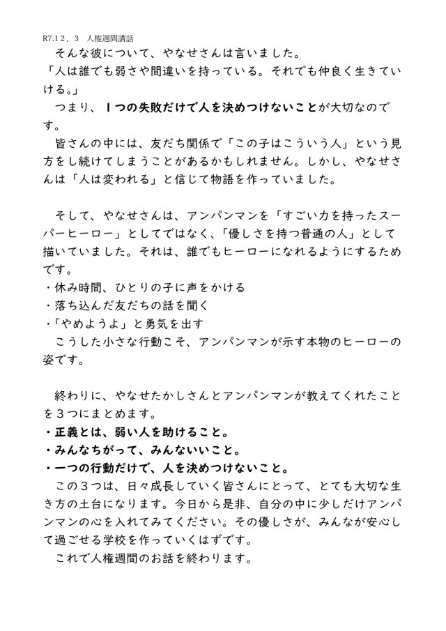もともとは体育館で集会の形で行うはずでしたが、インフルエンザ感染の拡大防止のために、放送を使って人権についての話をしました。本日使った原稿を掲載しますので、お休みしてしまった子にも読んでもらえると大変うれしいです。