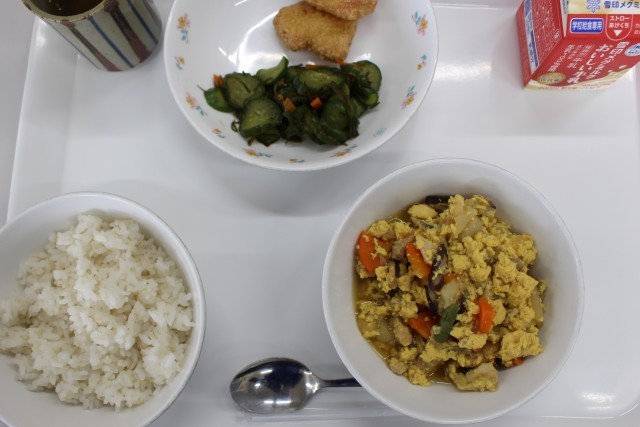 むぎごはん 牛乳 たまごとじ いかナゲット きゅうりの塩昆布和え でした。