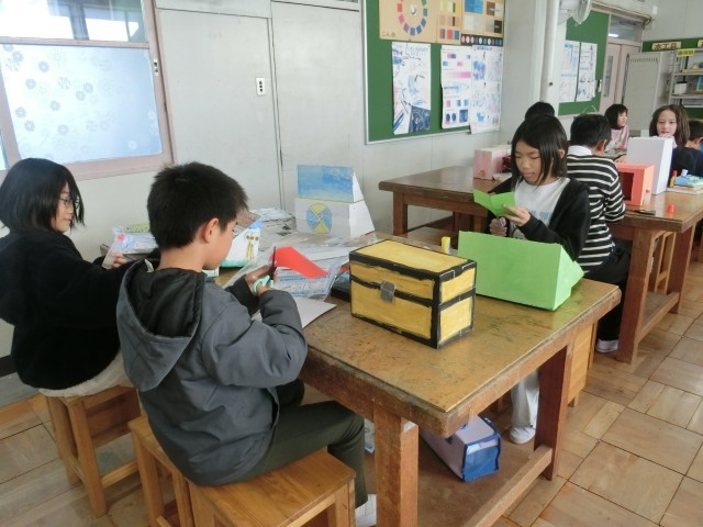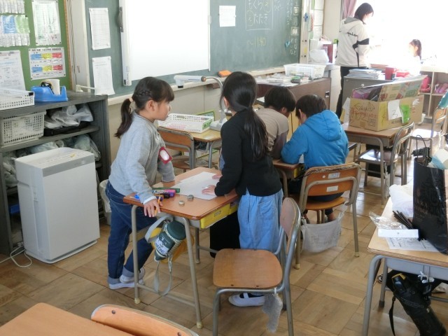 2年生では、今週末に行うおもちゃフェスティバルの準備を進めていて、子どもたちはグループごとにおもちゃや道具などを作っていました。3年生では、ドッジボールと鬼ごっこを分かれて行い、子どもたちは体づくり運動に励んでいました。4年生では、図画工作科でおもしろダンボールボックスを作っていて、子どもたちは作品作りに工夫を凝らして取り組んでいました。