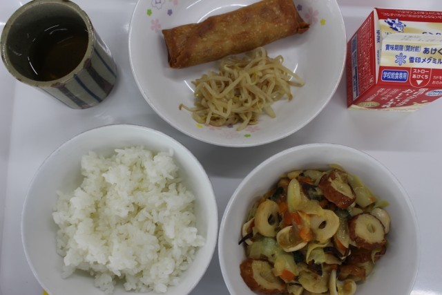ご飯 牛乳 きくらげ入り中華海鮮うま煮 はるまき もやしのナムル でした。