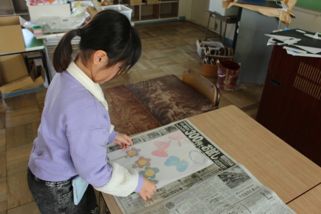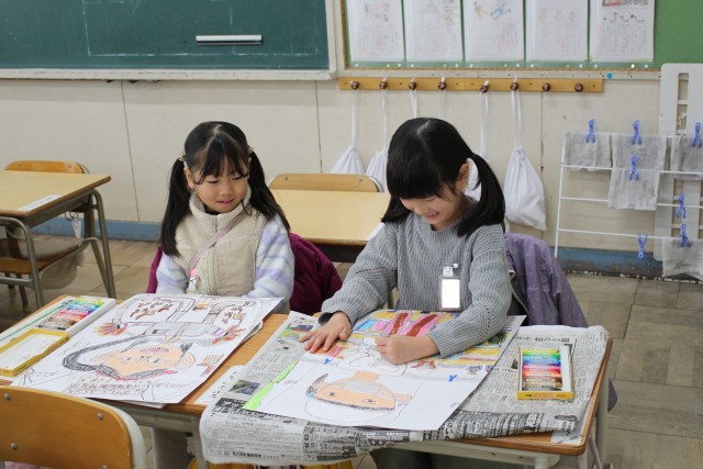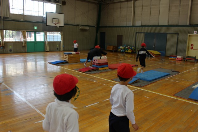 体育の授業では、跳び箱となわとびをしていました。図工の授業では、「せんせい あのね」という題名で絵を描いていました。