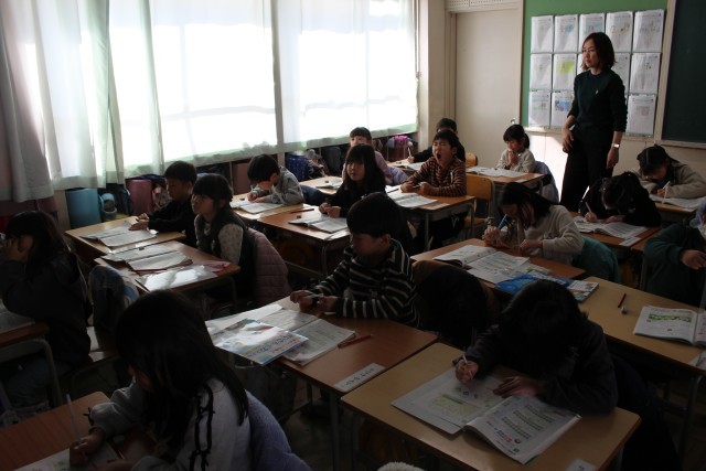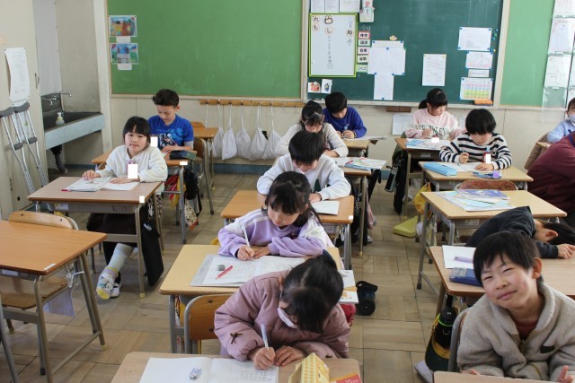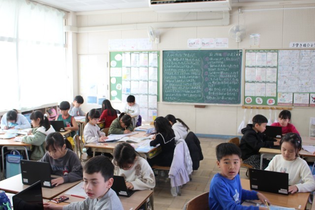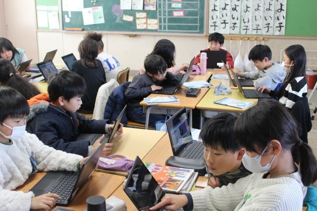 家庭科の授業では、ミシンやアイロンを使ってエプロンを作っていました。社会の授業では、伝統工芸品について調べていました。