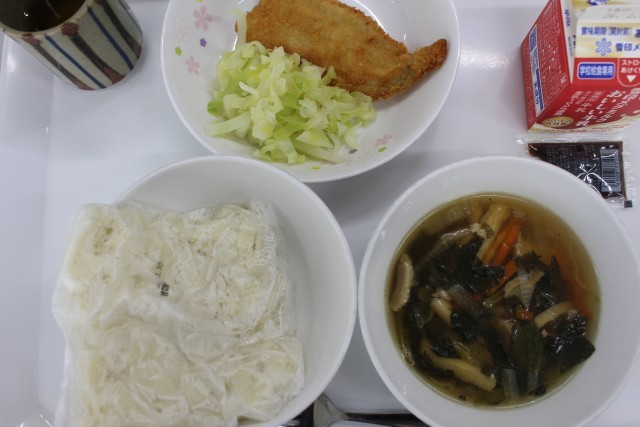 きしめん 牛乳 きしめんの汁 ニギスフライ ボイルキャベツ 中濃ソース でした。