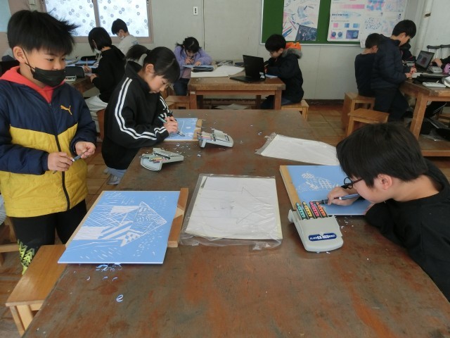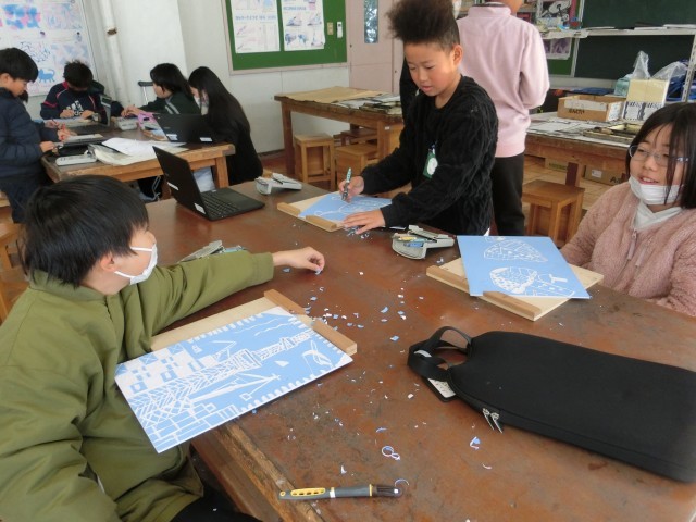 3時間目の4年生では、木版画に取り組んでいました。彫刻刀で彫る作業が終わった子から、紙に刷る作業に取り掛かっていました。