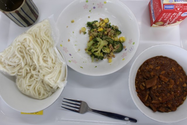 ソフトめん 牛乳 ジャージャーめんの具 ブロッコリーとツナのサラダ でした。
