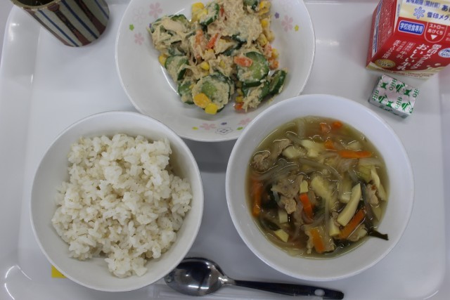 麦ご飯 牛乳 はるさめスープ バンバンジーサラダ ベビーチーズ でした。