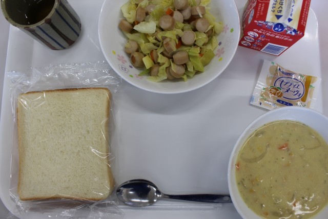スライスパン 牛乳 コーンポタージュ キャベツとウインナーのソテー みかんジャム でした。