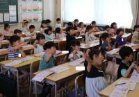 今日は多くのクラスで書の時間に取り組んでいました。算数の時間では、土地の面積のそれぞれの大きさを出すときにどの面積を基準すればよいか考えていました。