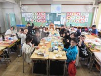 校長室で給食試食会を行いました。みんなで配膳して、給食を味わいました。紙パックに...