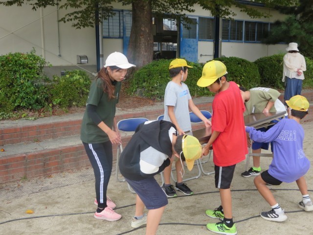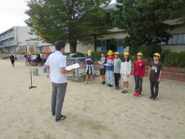 今年度から、準備と片づけは5・6年生が委員会ごとに分かれて行います。委員会の先生のもとに集まり、指示を聞いてから開始しました。明日も各学年の種目以外にも、活躍する場面をたくさん見つけてほしいです。