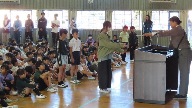 朝会です。校長先生から、「日没が早いので、車から見えにくい。横断歩道を渡るときは立ち止まる」「学校周りの道路に大きなうんちが落ちている。地域で過ごしやすくするためにはどうするか。周りのことを考えて行動してほしい」というお話がありました。みなさんも、先生方も、地域の一員です。周りのことを考えて行動できるといいですね。