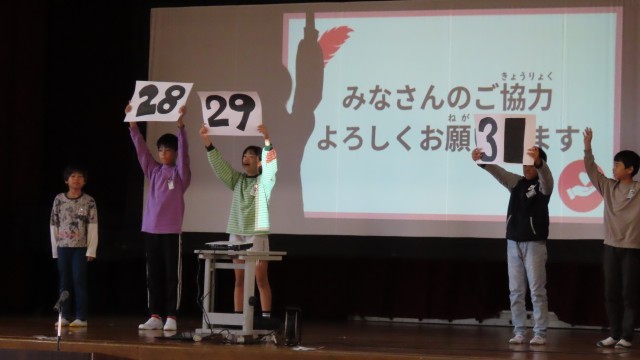 さらに、赤い羽根募金について連絡がありました。「劇団児童会」の登場です。募金は28日、29日、31日に集めます。劇団員にインタビューをしました。「募金は、地域の障害のある方、お年寄りの見守り、災害ボランティアなどに使われます。たくさん集め、役に立ってほしいです。ご協力をお願いします」
