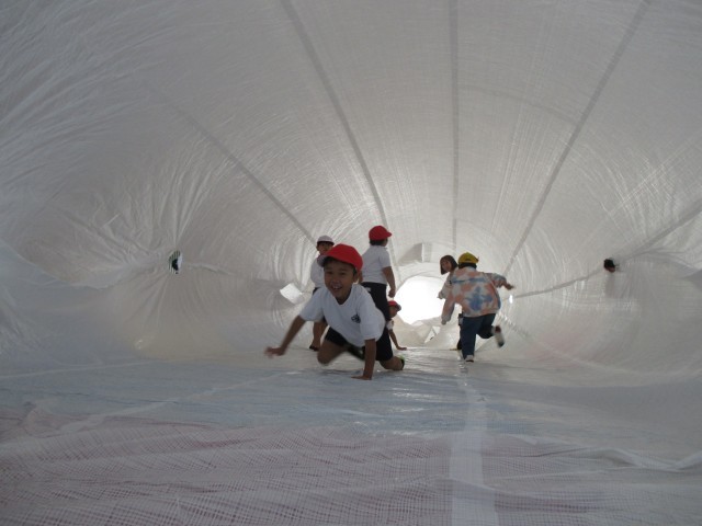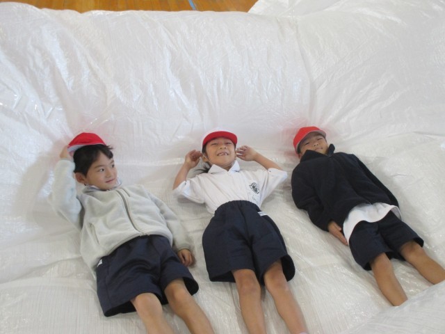 くじらぐもの上はふわふわ、まるで本当に雲の上にいるようで、子どもたちの笑顔が自然とはじけます。