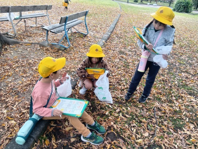 三ツ又公園に、秋見つけに行きました。きれいな色の葉っぱや木の実などをたくさん拾うことができました。学校に戻ってからは、見つけた葉っぱ等を使ってお面を作りました。どの子もかわいらしいお面を作ることができました。