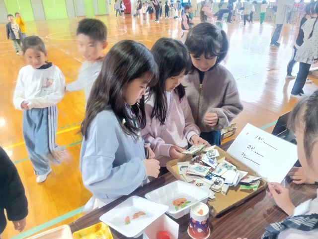 2年生が「おもちゃまつり」に招待してくれました。「どんな遊びがあるのかな?」と、とてもわくわくしていた子どもたち。体育館に入ると拍手で迎えられて、とっても嬉しそうでした。遊び方を分かりやすく教えてくれたり、優しく声をかけてもらったりしてとても楽しかったようです。2年生のみなさん、ありがとうございました。