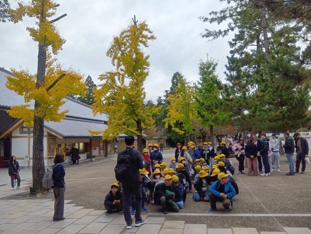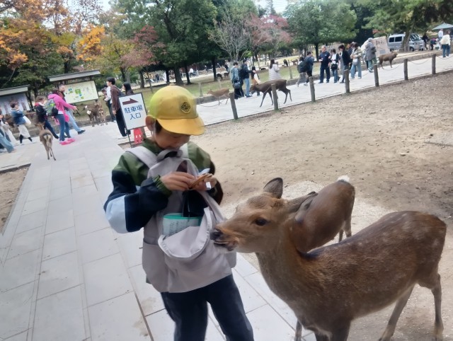 鹿せんべいを買って、鹿にあげました。ちょっと怖いと言う子やかわいいと頭をなでる子。いろいろでしたが、楽しんでいました。これから京都のホテルに向かいます。みんな元気てす。