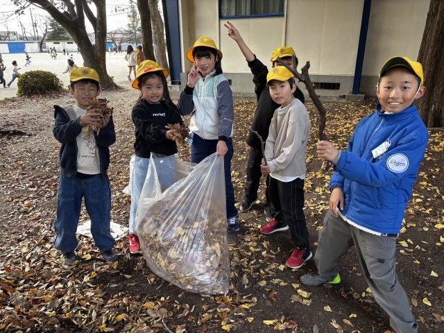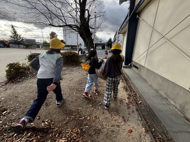 「松原の森」には、自然があふれています。今は紅葉の季節が終わることから、毎日たくさんの落ち葉があります。放課になると、自らボランティアで落ち葉を拾う子達もいます。楽しみながら進んできれいにする子ども達の姿が微笑ましいです。