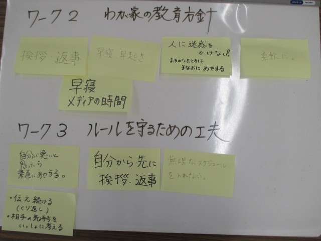 ①については、安心して過ごせる場所、何でも話せる場所、ルールを教えたり、しつけをしたりする場所と書き込みました。②については、小さい頃なら、いつもにこにこしていてほしい、ああだこうだと言わないでほしいと思っていたと思いますが、ほぼ自立した今なら「ダメなことはダメっていってほしい」「必ず守ってくれる場所」と答えるのではないかなと予想します。私自身も、ダメって言える、そして何があっても全力で守ることができる親でいたいと改めて考えることができました。