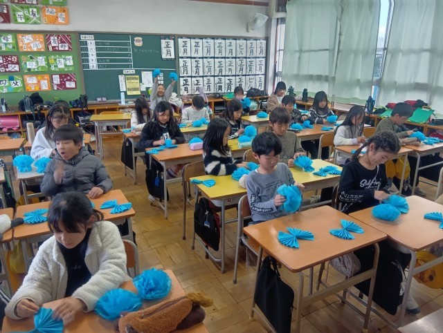 3年生は、6年生を送る会に向けて、お花づくりに取り組みました。「どうしたらきれいになるかな」と考えながら、試行錯誤する姿が見られました。放課の時間には、実行委員さんが中心となり一生懸命練習に励んでいます。