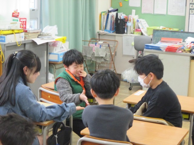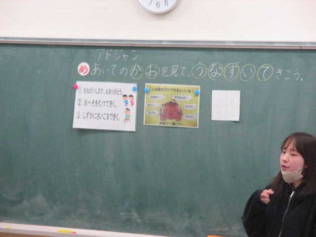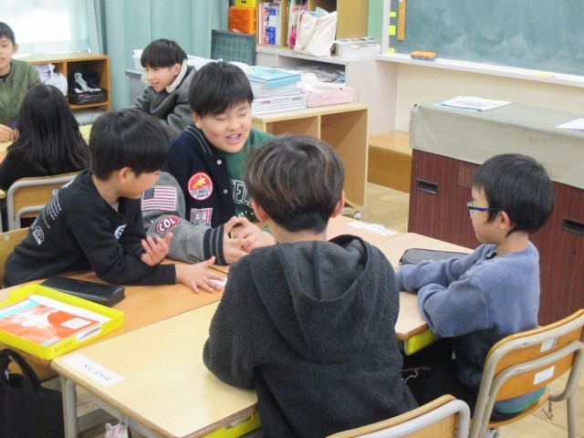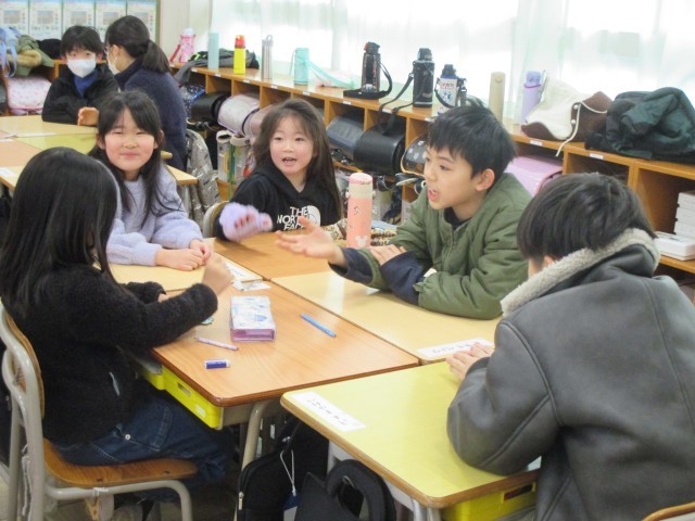 今日のにっこりタイムは「アドジャン」です。初めてのチャレンジでしたが、ペア学年のお兄さん・お姉さんがいるので、指の足し算も安心、スムーズに答えることができました。お兄さん・お姉さんと1年生の答えが同じだったのが、とても興味深いです。