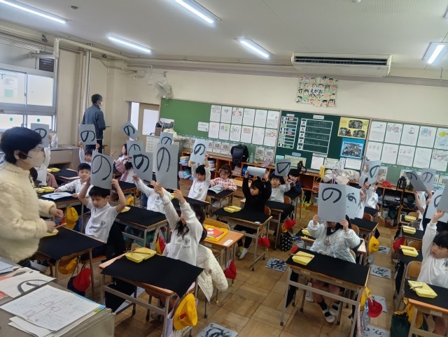 1年生は、水習字をしました。先生に教えていただいて、授業の最後には「の」を上手に書くことができるようになりました。1年生の水習字の授業は、今日が最後でした。来年度も頑張ってほしいです。
