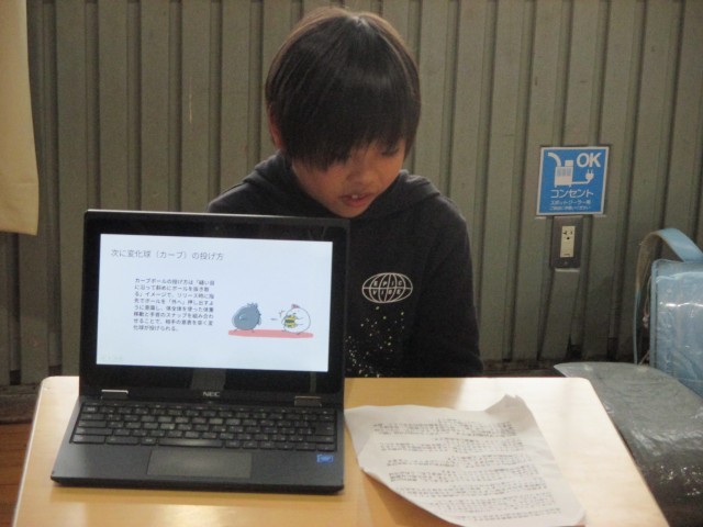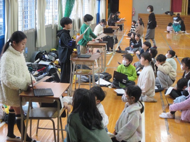 本校では、4~6年生の総合的な学習の時間として「個人探求」に取り組んでいます。子どもたちは各々で興味のあることについて、深く掘り下げていきます。高学年になると、情報を活用する力が身に付いてきており、集めた情報を比較・分析し、見る人が分かりやすいようにスライドを作成します。そして、今日は成果を発表しました。聞いてくれるのは3年生。3年生は、4月から実際に取り組むための準備をすることができました。
