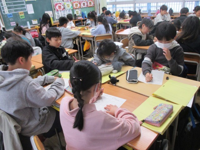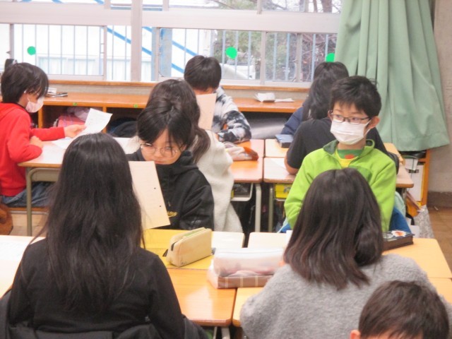 火曜日の業前に継続している「にっこりタイム」は、今日が最後になりました。最後のエクササイズは「いいとこみつけ」です。友達から自分のいいところ2つに〇がもらえます。どこに〇がもらえたのか、どきどきしながらワークシートを見ました。「話を聞いてくれる」に〇が付いていて、自然と笑顔になれました。