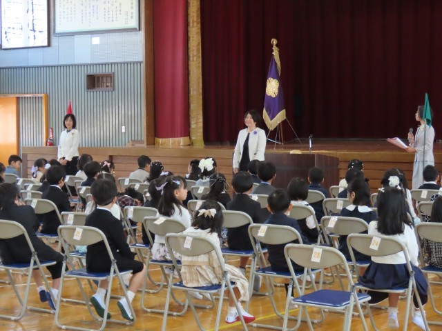 朝はひんやりとした空気に包まれましたが、天気に恵まれ、穏やかな雰囲気のもと入学式を迎えました。新1年生は81名。ご入学おめでとうございます。大きなランドセルを背負い、かわいいお洋服に包まれた子どもたち。普段通り笑顔いっぱいの子、大きな声で挨拶をする子、緊張している表情の子、小学校生活が不安そうな子、お家の方に手を引かれて歩く様子がとても素敵でした。