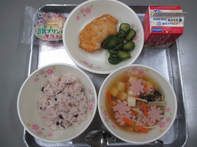 2年生から6年生は、今日から給食が始まりました。「お祝い献立」です。メニューは「せきはん ぎゅうにゅう さくらのすましじる とりにくのからあげ きゅうりのおかかあえ こめこプリンタルト」久しぶりの給食...