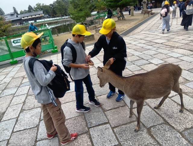 鹿せんべいを買って、鹿にあげました。ちょっと怖いと言う子やかわいいと頭をなでる子。いろいろでしたが、楽しんでいました。これから京都のホテルに向かいます。みんな元気てす。