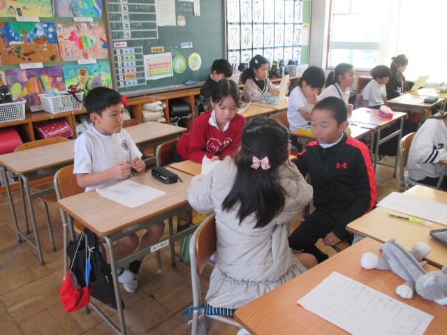 今日のにっこりタイムは「いいとこみつけ」です。2学期を振り返り、友達のいいところを探します。「お願いします」と言って、隣の子に用紙を渡します。友達から、ぼくのいいところに○がもらえます。先生の合図で用...