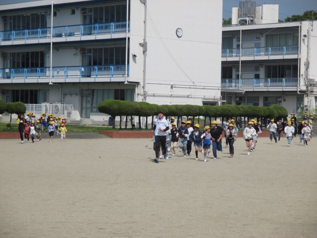第一回目の避難訓練です。震度6程度の地震が発生した想定で行いました。大きな揺れを感じたら、机の下にもぐります。揺れがおさまったら、避難経路を通ってグラウンドの避難場所に避難します。①口を閉じて、落ち着...