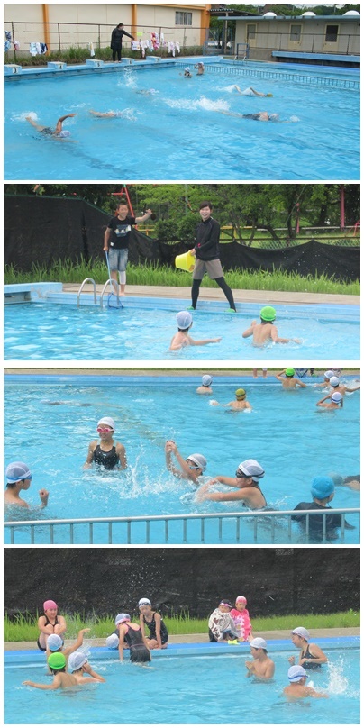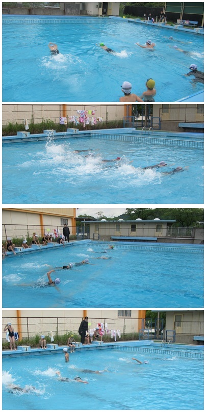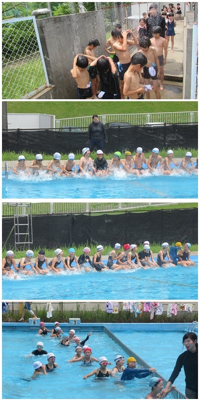 5年生 初めてのプール 曇っててかなり寒がっていましたが、身体を水に慣らした後、クロールと平泳ぎの泳力測定を行いました。最後にちょっとだけ自由時間でした。