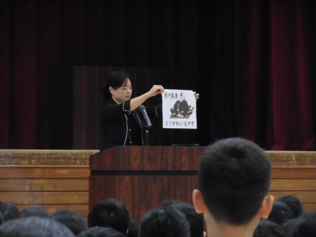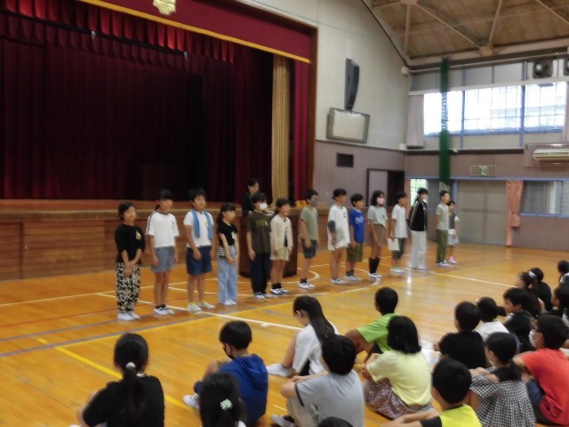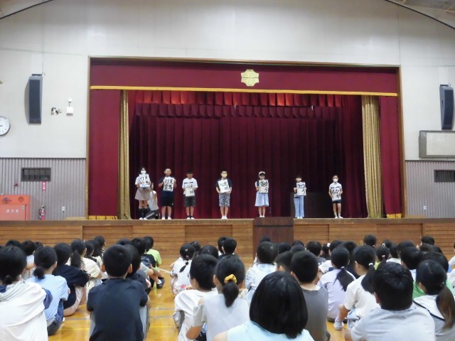 続いて、席上揮毫大会の選手壮行会があり、代表選手が一人ずつ全校児童に意気込みを伝えました。