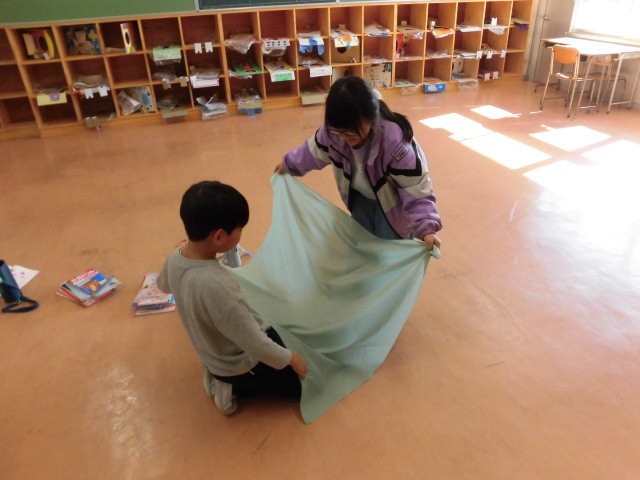 3年1組、ふろしきを使って、水筒、教科書、ボールを包んで、良さを体験していました。