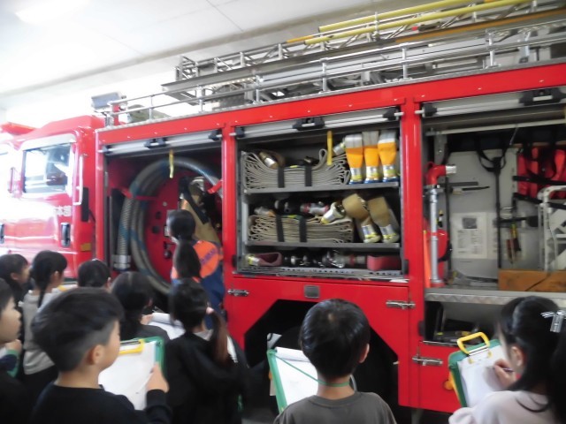 社会科「火事からくらしを守る」の学習のまとめとして、春日井市消防署東出張所に見学に行ってきました。6台ある消防自動車や救急車に乗ったり近くで装備を見たり、施設内のトレーニングルームや仮眠室なども見たりすることができました。また、実際に使用されている防火服を着てホースを持って放水体験もさせていただき、学校だけでは学ぶことができない貴重な体験をたくさんさせていただきました。実際に出動していく姿も目にし、こうやって自分たちの安全な暮らしが守られていることを見て感じることができました。