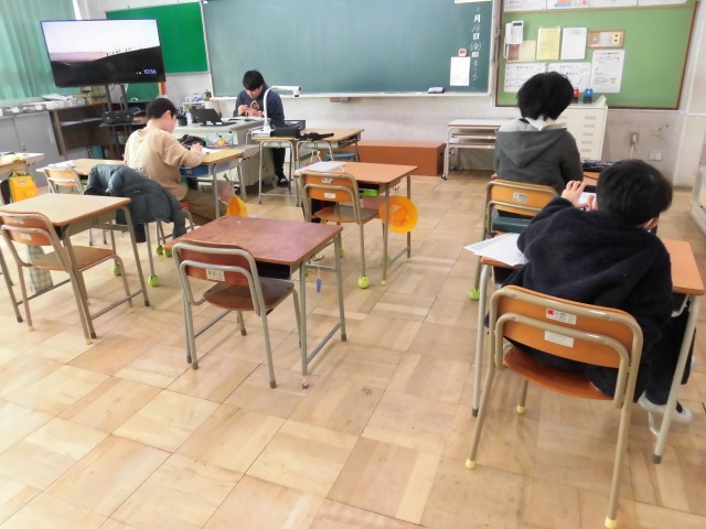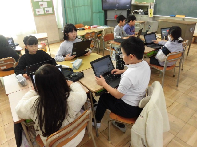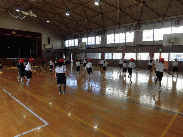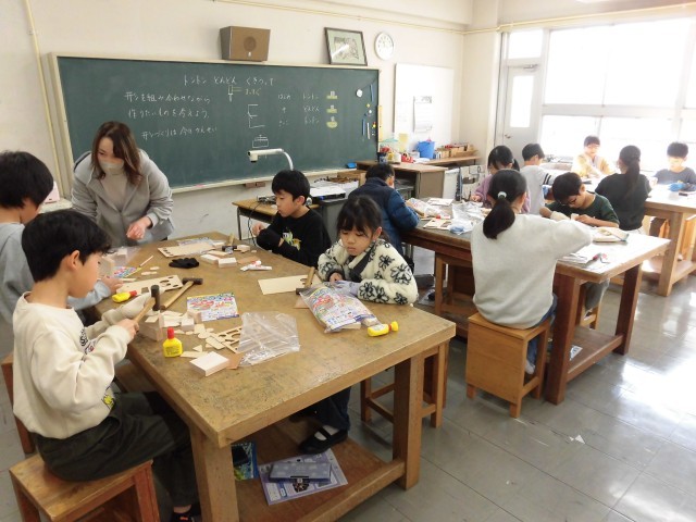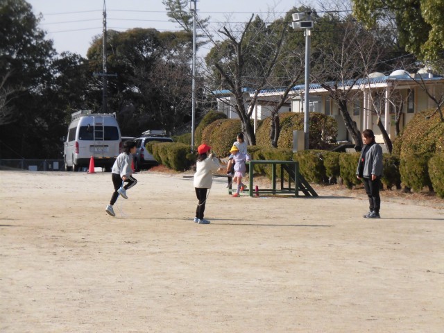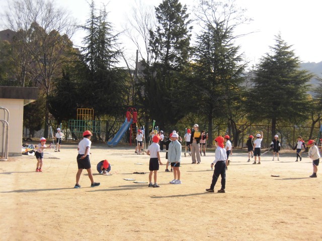今日は暖かい日になりました。今週はなわとびWEEK。1・2年生・4組は、体育の授業でもなわとびを跳んでいました。3年生は、くぎをトントン打って作品つくりや、総合学習の発表の準備・練習をしていました。