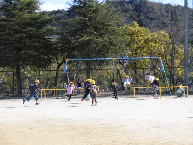 お昼の休み間の様子です。運動場では、ブランコ、ドッジボール、一輪車やなわとびで元気よく遊んでいました。校舎内では、相談室でおしゃべり、教室でカードゲーム、保健室で掲示物づくりなど、楽しい時間を過ごしていました。