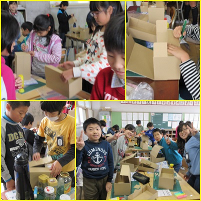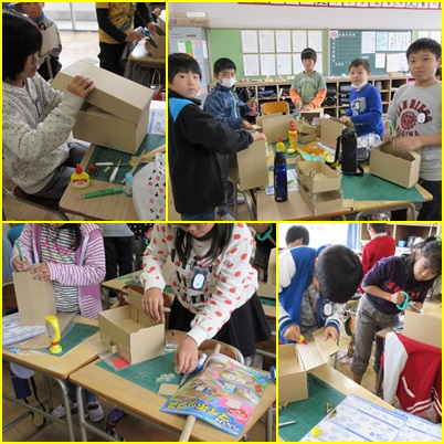 4年生が、図工でボックスづくりに取り組んでいました。だんボール紙を使って、引き出しボックスやふた付きのボックスなど、収納ボックスを作るとのことです。みんな、慎重に作品づくりに取り組んでいました。