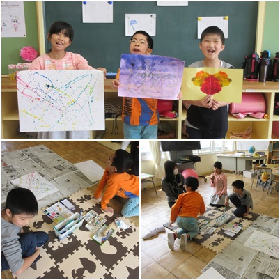 図工で絵の具遊びをしました。楽しそうに取り組んでいました。途中ですが、ちょっと手を休めて、みんなで作品をもって写真をとりました。
