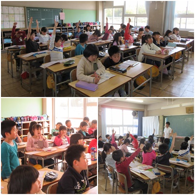 1組は社会で、学校のまわりのお気に入りの場所を紹介するという内容の勉強をしていました。2組は、国語の新出漢字の勉強をしていました。いっぱい手が挙がっていました。