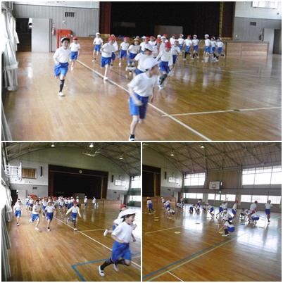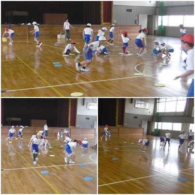 円形の両面カラーのスモールマットを裏返すゲームで、楽しみながら運動に取り組みました。どの子も元気いっぱい、思い切り体を動かすことができました。