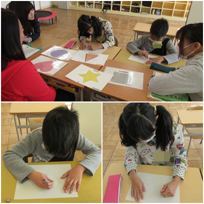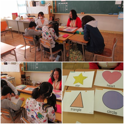 今日はALTの先生がいらっしゃる日です。写真は、5,6組の子どもたちへ英語の授業の様子です。今日は、形の勉強です。カードにある形を取り入れた絵を描いていました。