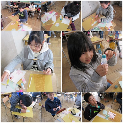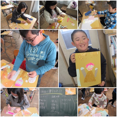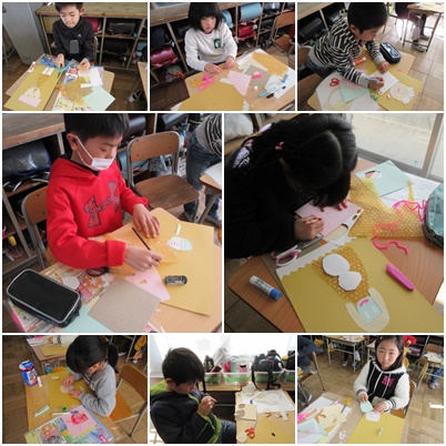 3年生が図工で版画に取り組んでいます。デコボコ模様のある紙やプチプチマットを切り抜いては、台紙に貼っていきます。テーマは、「3年生で楽しかったこと」です。3年生の思い出がつまったすてきな作品を作ってくださいね。