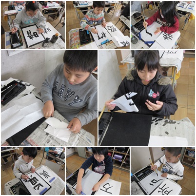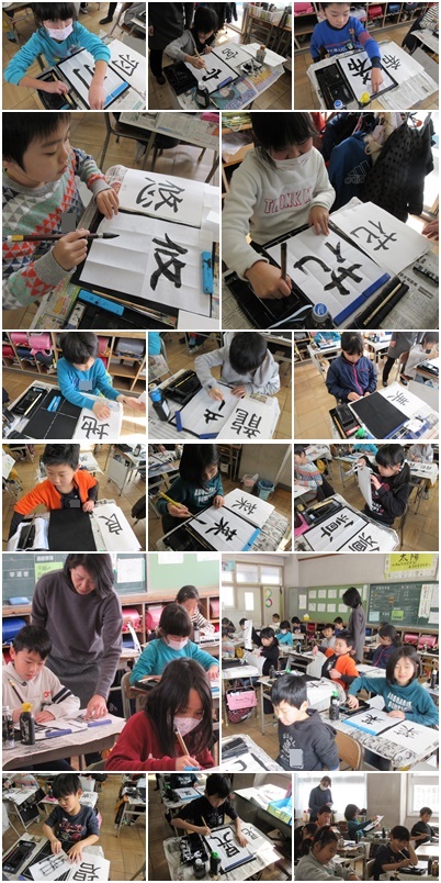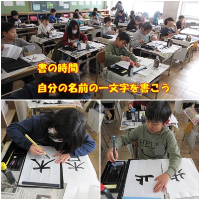 3年生の教室に、書の先生が来てくださいました。今日は、自分の名前の一文字を書くということで、いつもよりさらに気合が入っているようです。楽しみながら書けましたね。