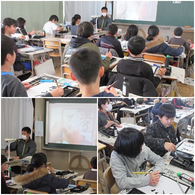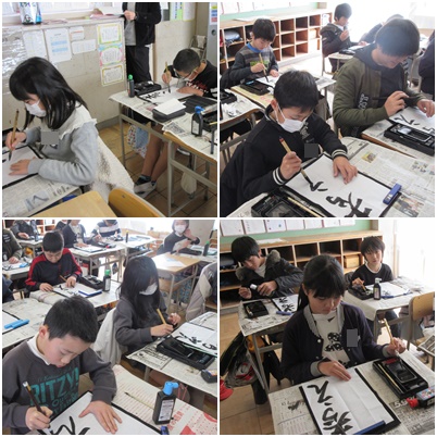 5年生の書の時間のようすを紹介します。落ち着いた雰囲気の中、丁寧に課題に取り組んでいました。