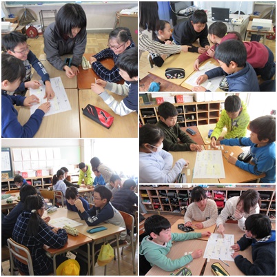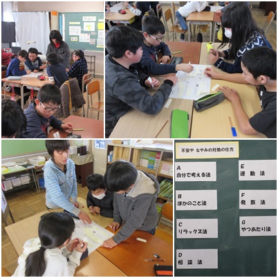 保健の先生による5年生対象の保健学習の授業の様子を紹介します。今日の勉強は、「不安やなやみ」について考えるというものです。写真は、不安やなやみの対処法を付箋に書き、グループで話し合い、7つの方法に分類しているところです。協力して作業に取り組んでいました。